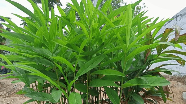 A perennial rhizomatous herb, similar to ginger, growing up to 1.5 meters in height with aromatic rhizomes.