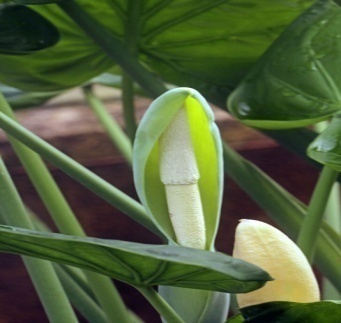 Flowers: Produced in spadix enclosed by a greenish spathe; typical of Araceae family.