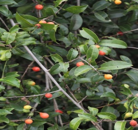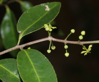 पत्तियाँ साधारण, विपरीत, अंडाकार एवं हरी चमकदार होती हैं।