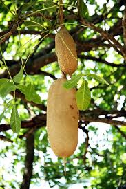 फल बड़े, लंबाई 30–60 सेमी, मोटा, गहरा भूरा, सॉसेज जैसे आकार के